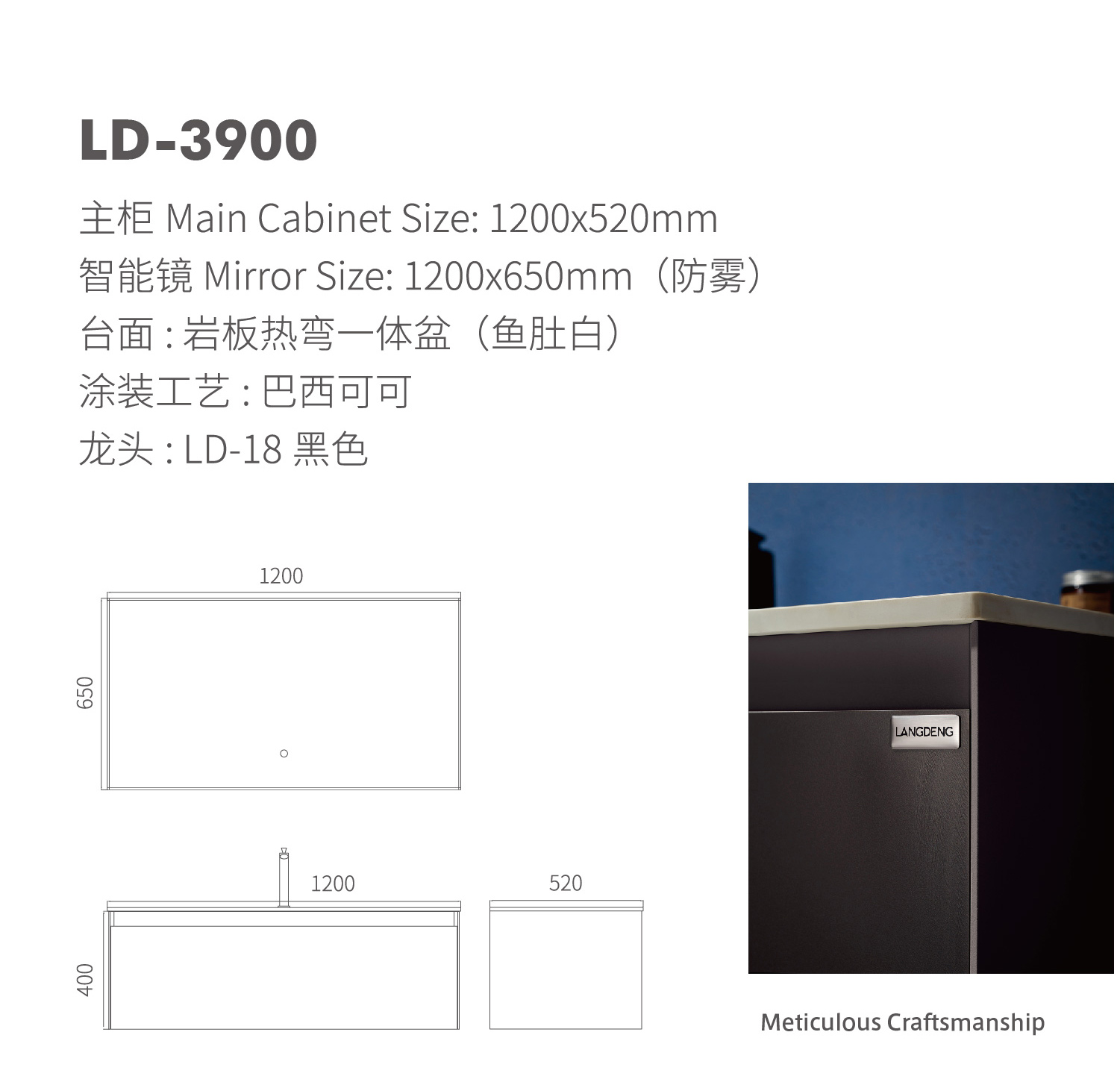 【主 柜】 Main Cabinet Size: 1200x520mm【智能鏡】 Mirror Size: 1200x650mm(防霧)【臺 面】 : 巖板熱彎一體盆(魚肚白)【涂裝工藝】 : 巴西可可【龍 頭】 : LD-18 黑色